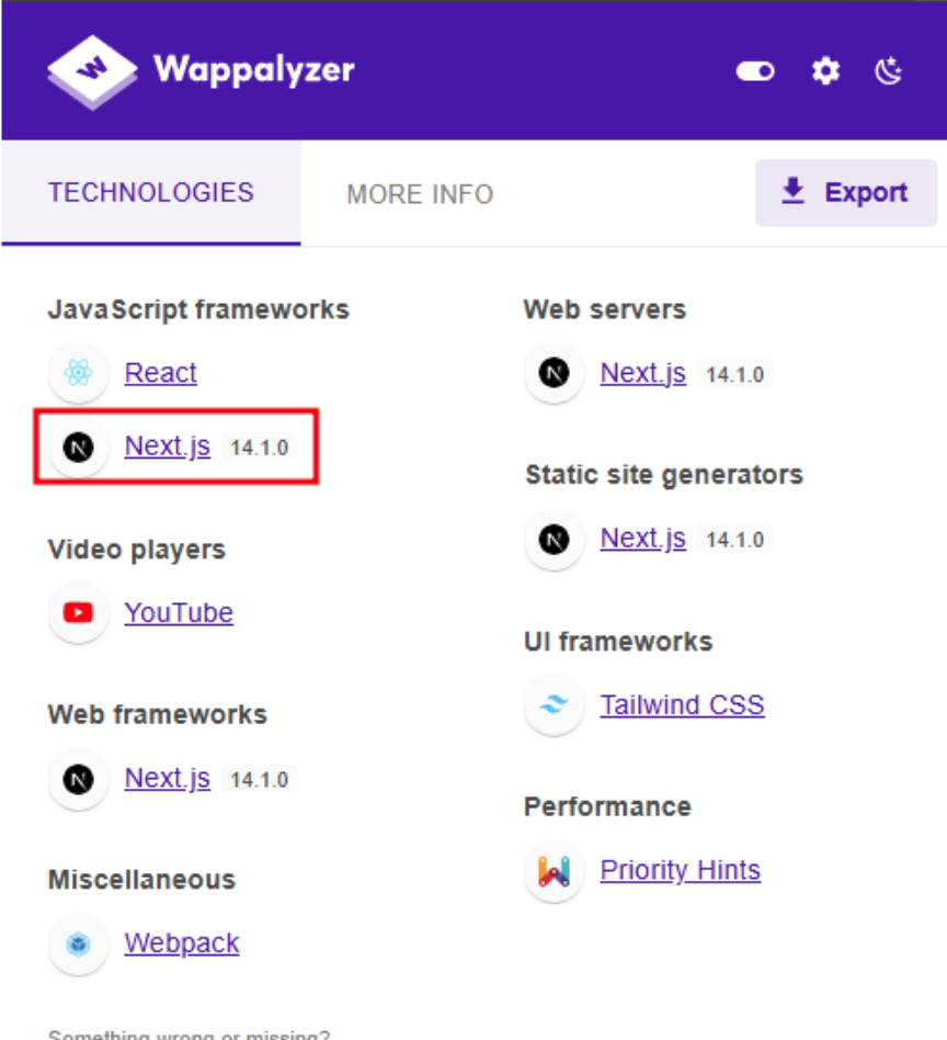 Jika dilihat menggunakan wappalyzer, diketahui bahwa web menggunakan nextjs versi 14.1.0