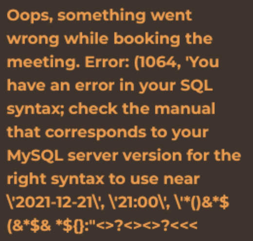 Kami menemukan bahwa terdapat dua input yang vulnerable, yakni pada pertanyaan “Who is the meeting with?” dan juga “What is the meeting topic?”.