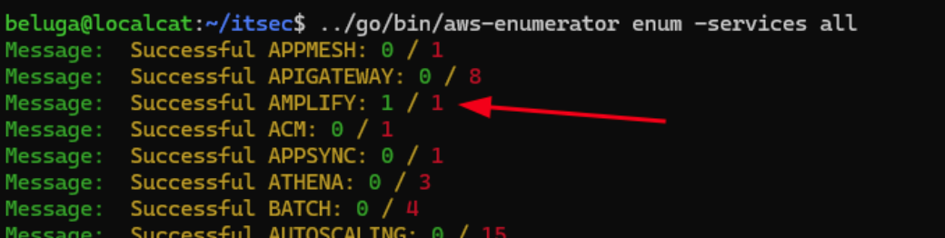 Kemudian kita lakukan enumerasi lagi menggunakan aws-enumerator. Disini langsung diketahui bahwa user saat ini memiliki akses ke amplify dan juga secretsmanager